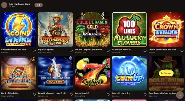 Les principales catégories incluent Machines à sous, Live Casino, Jeux de table, Jeux à jackpot, Paris sportifs, eSports et jeux Crash. Si vous aimez les choix à RTP élevé, vous pouvez parcourir des machines à sous connues pour un bon potentiel de retour et utiliser les filtres pour trier par fonctionnalités et popularité.