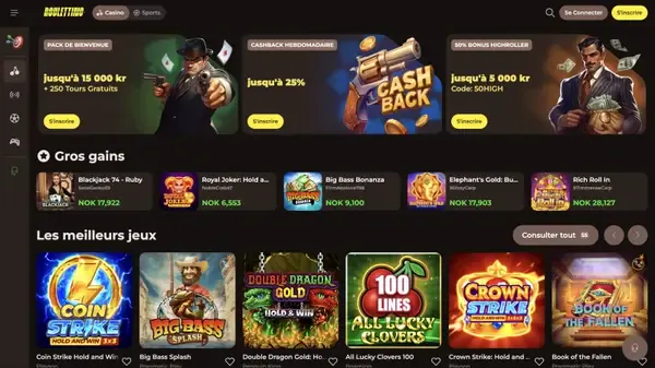 Pour la France, nous proposons plus de 6 000 jeux de casino ainsi que les paris sportifs et des marchés eSports sur le même compte. Cela rend Roulettino Casino France pratique pour les joueurs qui veulent des machines à sous, des tables en direct et des paris sur les matchs sans changer de plateforme.